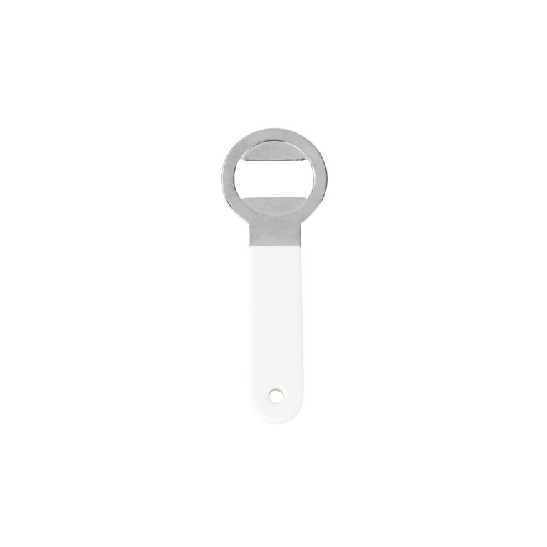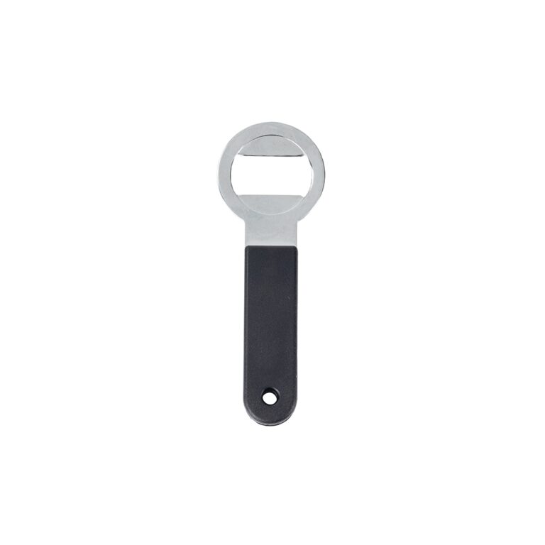 Abridor de garrafas com argola em aço carbono e cabo com revestimento em plástico ABS.